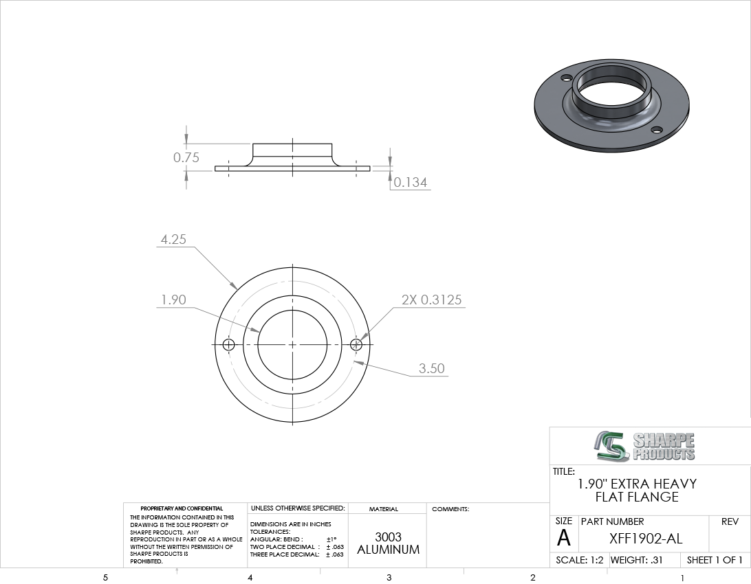 XTRA HVY FLAT FLANGE, 1 1/2 PIPE (1.90 O.D.) W/(2) HOLES, ALUM 3003
