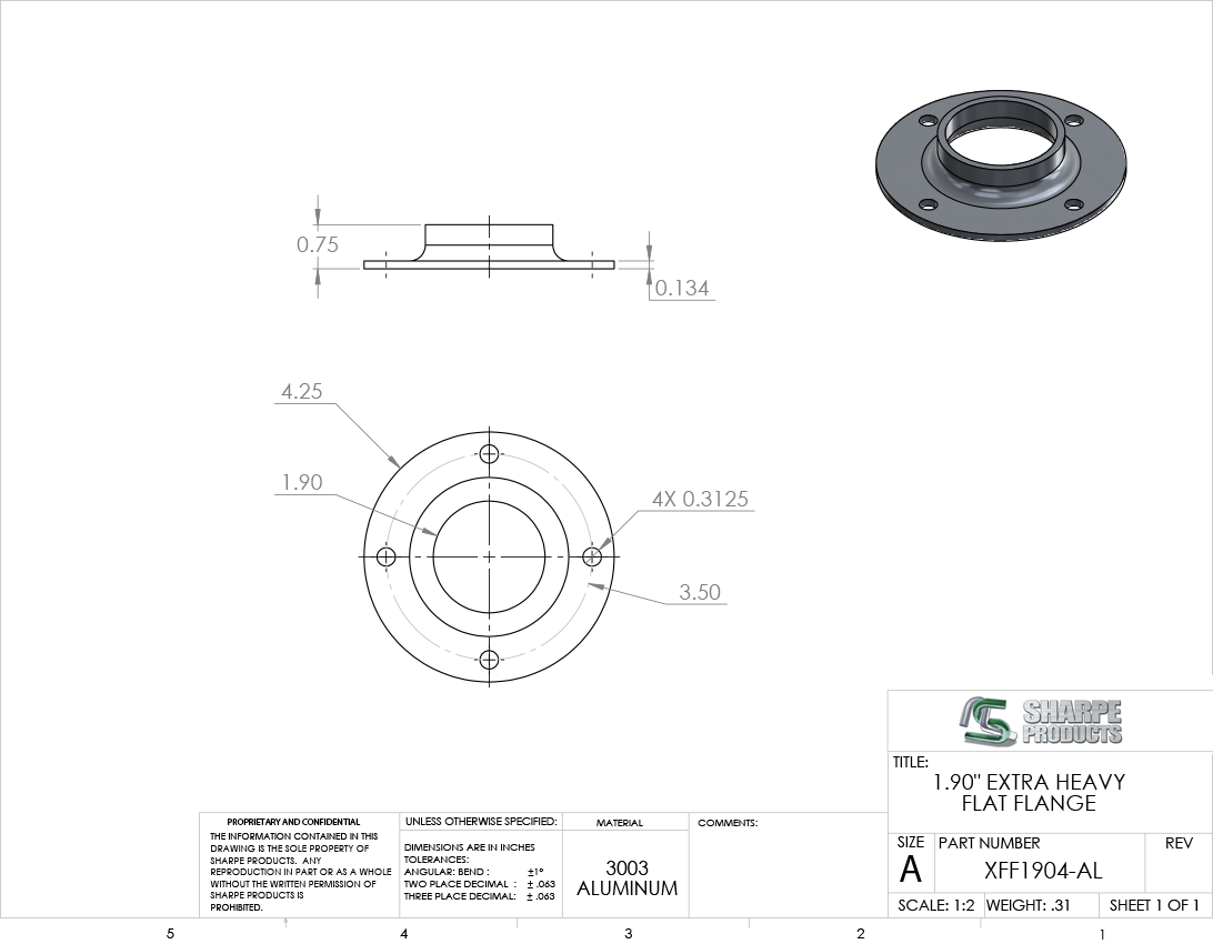 XTRA HVY FLAT FLANGE, 1 1/2 PIPE (1.90 O.D.) W/(4) HOLES, ALUM 3003