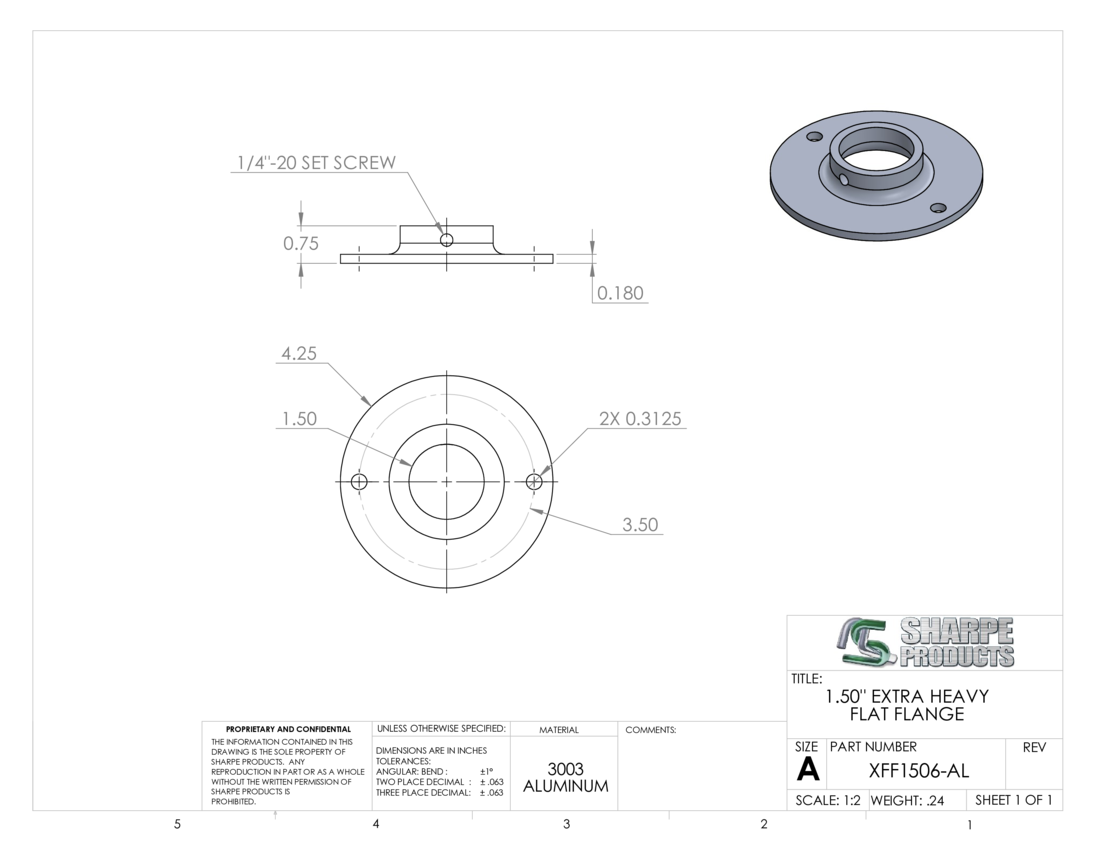 XTRA HVY FLAT FLANGE, 1 1/2 O.D. W/ (2) HOLES W/ SET SCREW, ALUM 3003