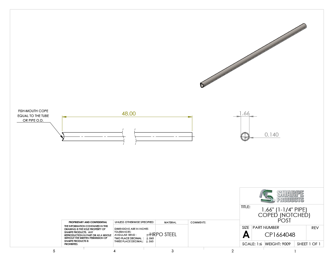 COPED POST STEEL, 1 1/4 SCH (1.66 O.D.) @ 48 LONG NOTCHED ON ONE END