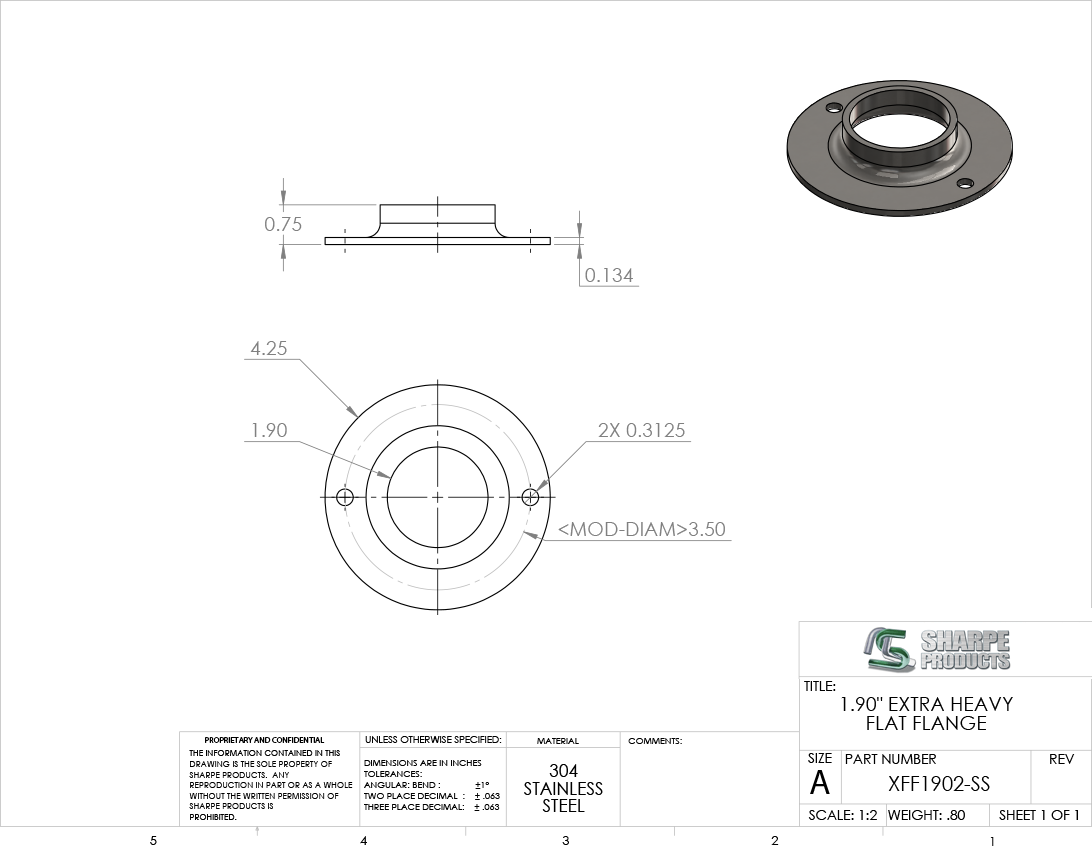 XTRA HVY FLAT FLANGE, 1 1/2 PIPE (1.90 O.D.) W/ (2) HOLES , S/S 304
