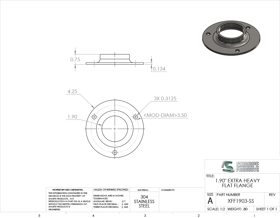 XTRA HVY FLAT FLANGE, 1 1/2 IPE (1.90 O.D.) W/ (3) HOLES, S/S 304