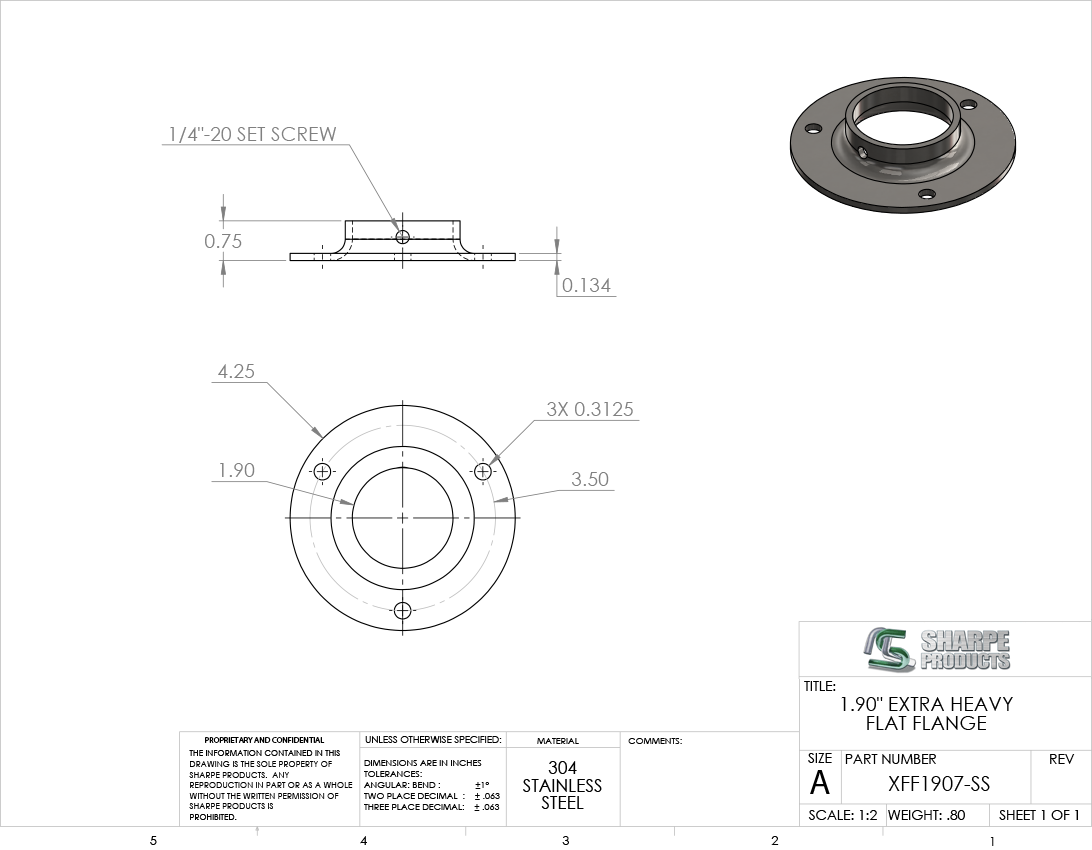 XTRA HVY FLAT FLANGE, 1 1/2 O.D.) PIPE W/ (3) HOLES & SET SCREW, S/S 304