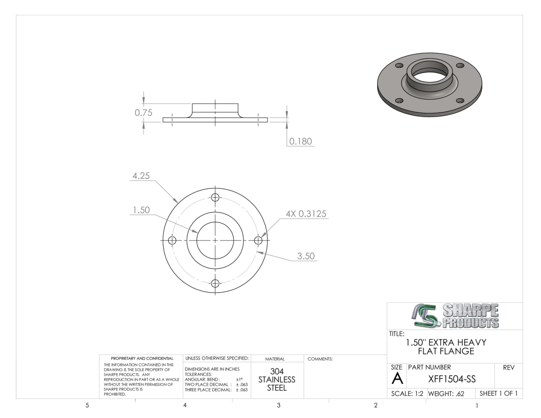 XTRA HVY FLAT FLANGE, 1 1/2 O.D. W/ (4) HOLES, S/S 3054 *MILL FINISH