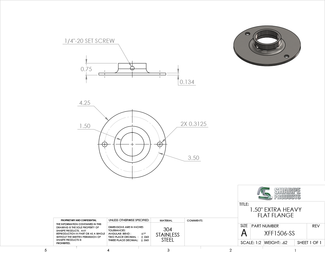 XTRA HVY FLAT FLANGE, 1 1/2 O.D. W/ (2) HOLES & SET SCREW, S/S 304 **MILL FINISH
