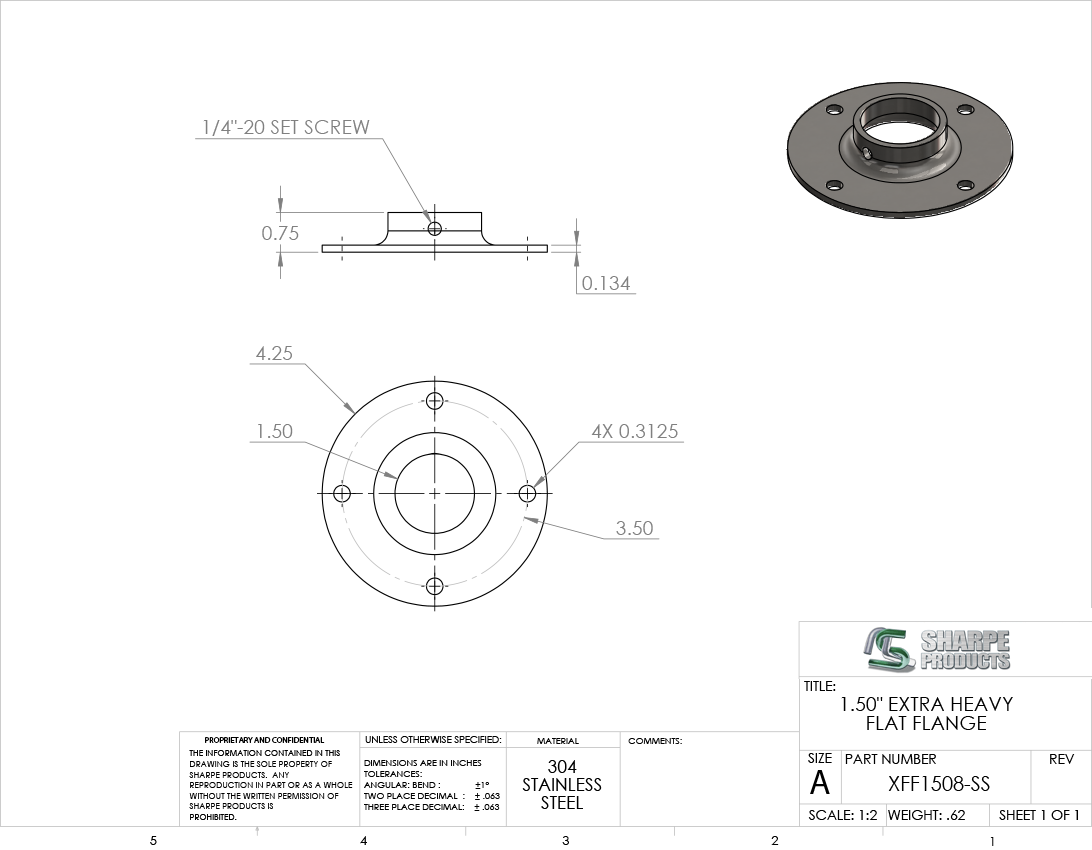 XTRA HVY FLAT FLANGE, 1 1/2 O.D. W/ (4) HOLES & SET SCREW, S/S 304 **MILL FINISH