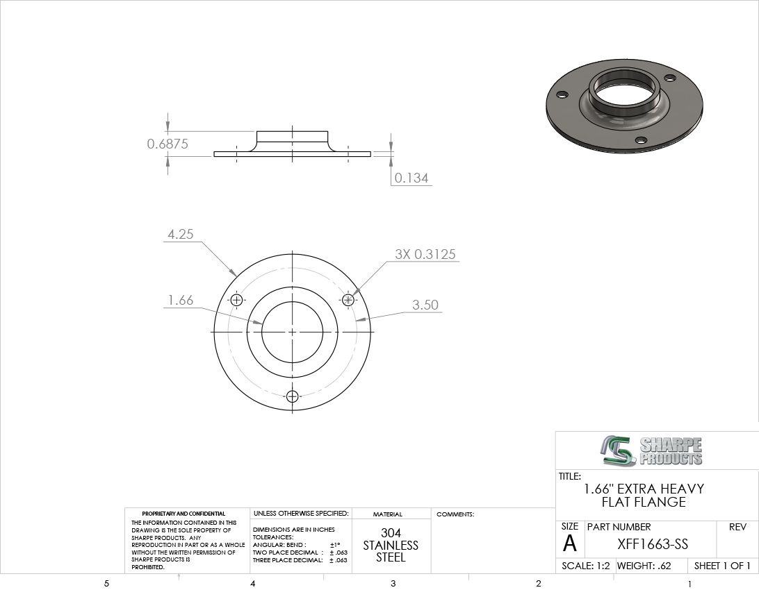XTRA HVY FLAT FLANGE, 1 1/4 PIPE (1.66 O.D.) W/(3) HOLES, S/S 304