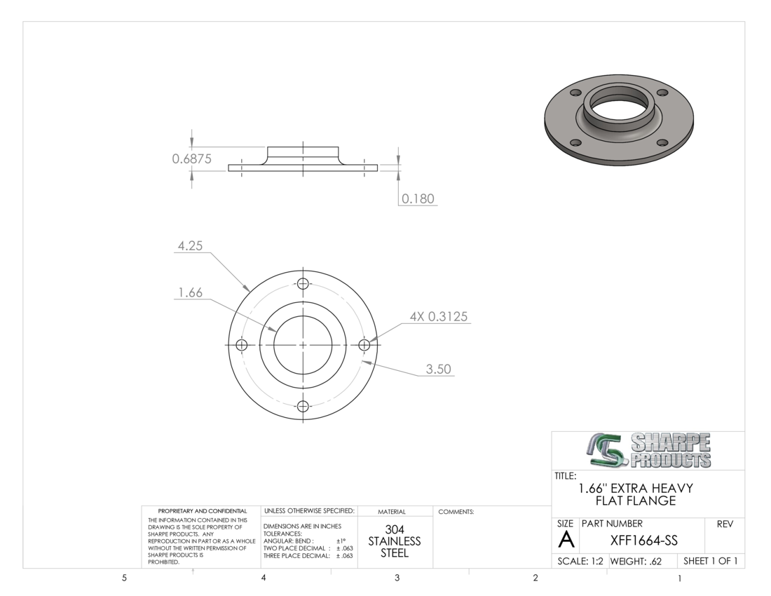 XTRA HVY FLAT FLANGE, 1 1/4 PIPE (1.66 O.D.) W/ (4) HOLES , S/S 304