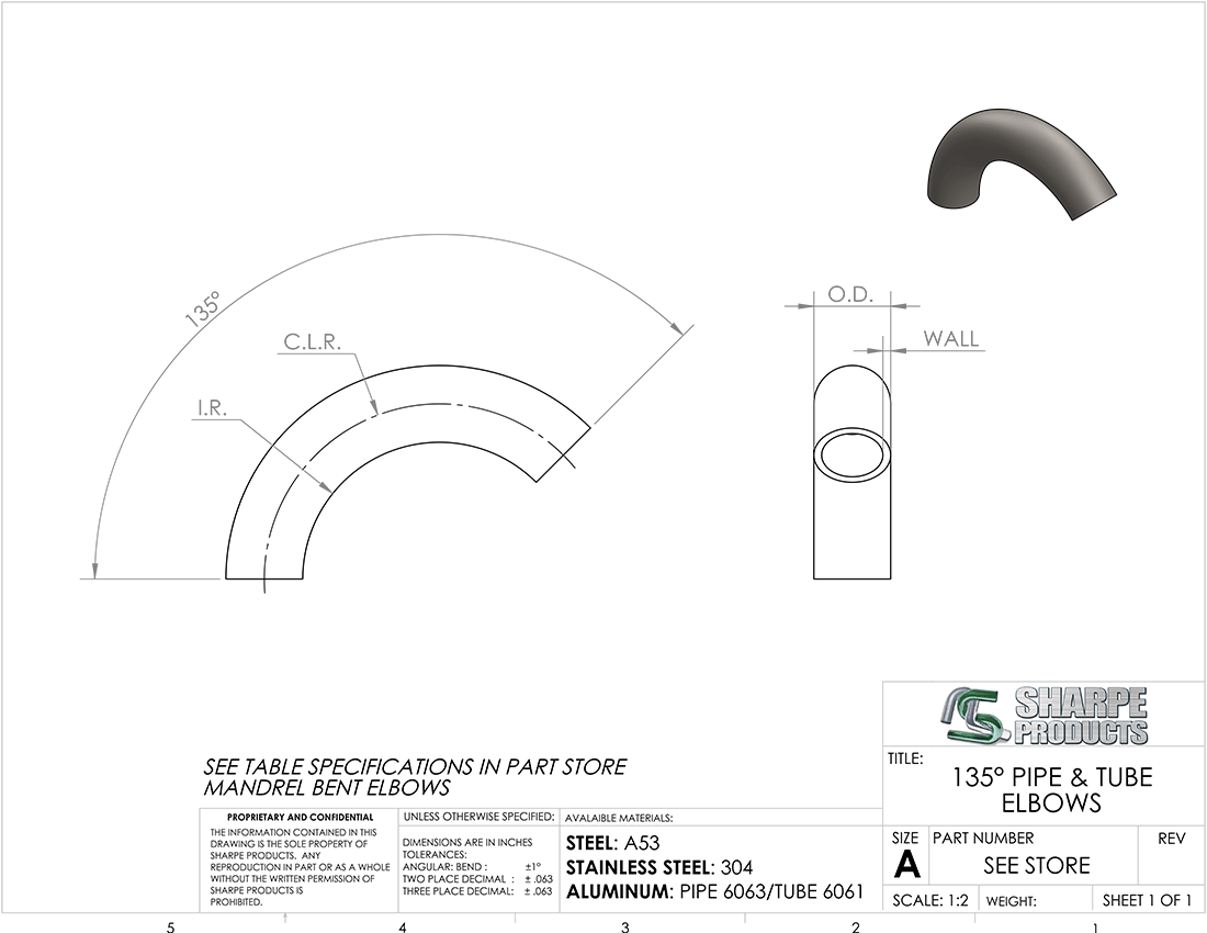 3/4" SCH 40 (1.05" O.D.) 135° ELBOW 2 1/2" C.L.R., S/S 304