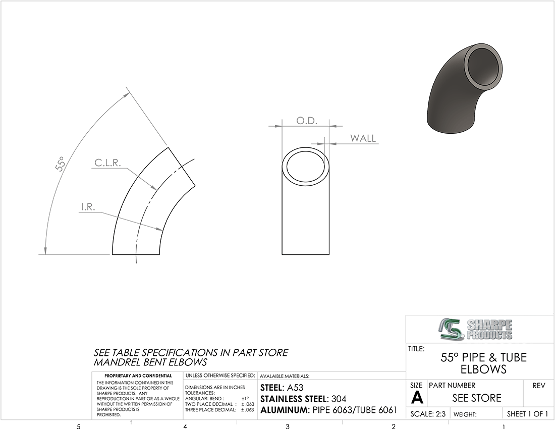 1-1/2" O.D. X .120 WALL (11 Ga.) 55° ELBOW 5" C.L.R., STEEL