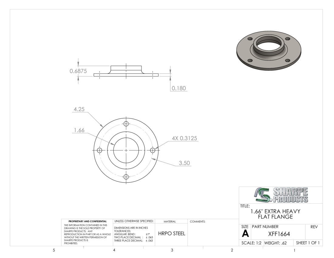 XTRA HVY FLAT FLANGE, 1 1/4 PIPE (1.66 O.D.) W/ (4) HOLES, STEEL